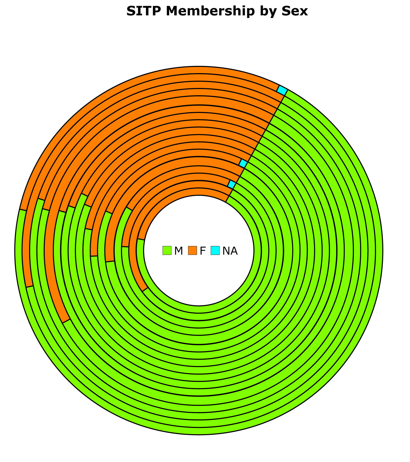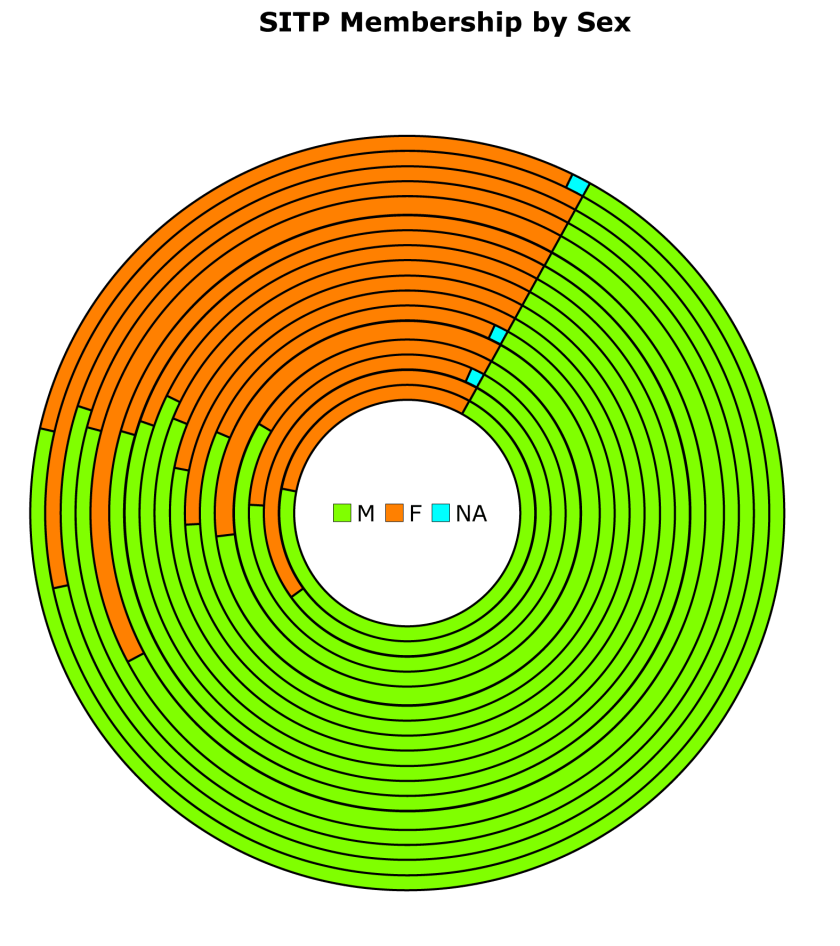 the requirement that the SITP chapter maintain a Facebook group page8. In total, I reviewed 1096 SITP members. While there were individuals who held memberships in multiple groups, I did not adjust for this minority group, mainly because if you want that kind of rigor, tell the leasing Skeptical organizations to get off their keisters and do it themselves. To the left, you can see a visually stunning pie-ish chart showing the representation of females in each SITP group (Figure 2). The relative size of each group is indicated by its position in the set of concentric circles, with the largest group on the outside (n=283) and the smallest group (n=20) on the inside (circumferences not to scale). The females are in orange. Obviously, that is not even close to 56%9.