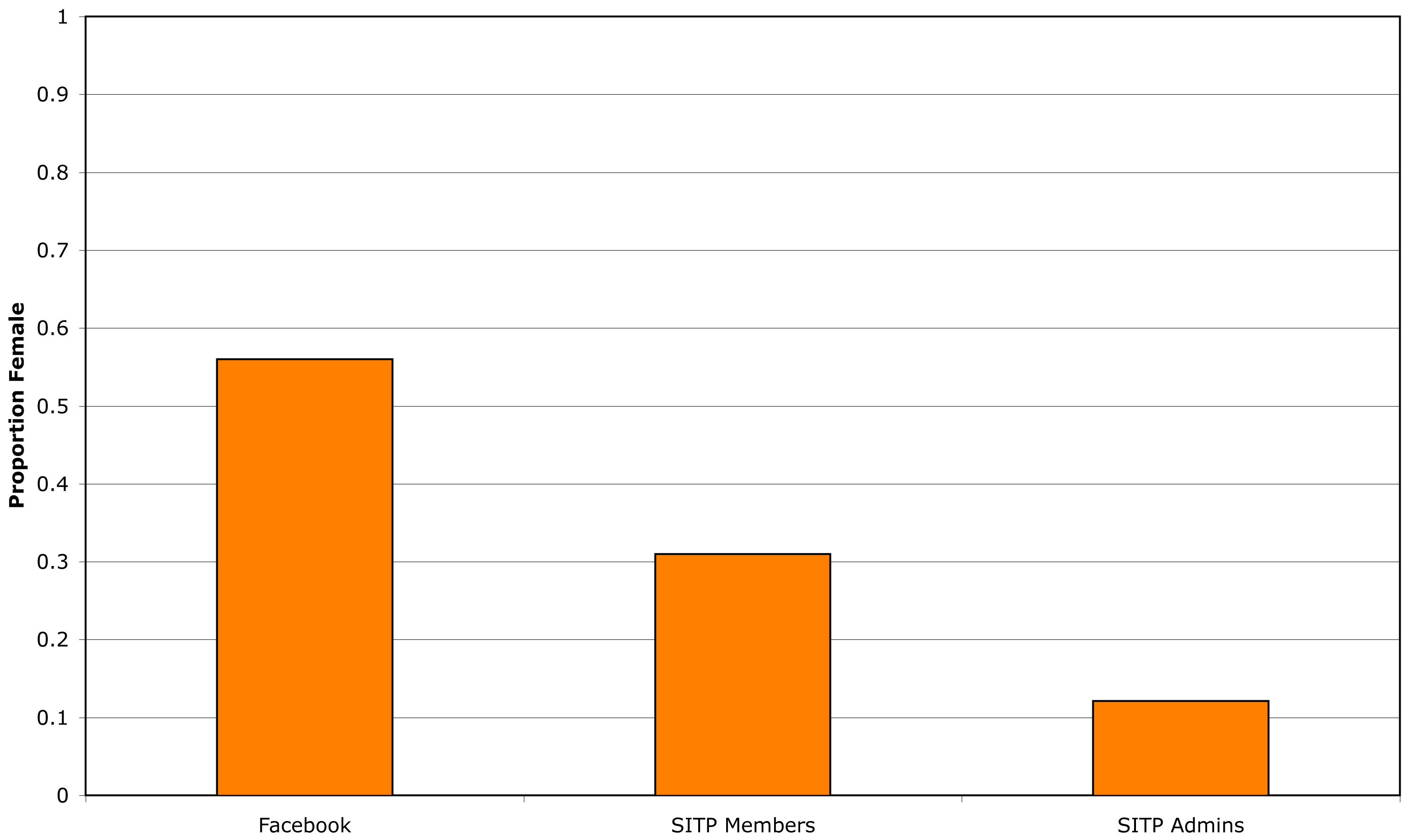 Females represent 31% of SITP members. This relationship holds across all SITP group sizes (Figure 3). Female representation in these Skeptical organizations is just barely over half of what we would expect by chance (i.e., Facebook users just randomly choosing to join groups).