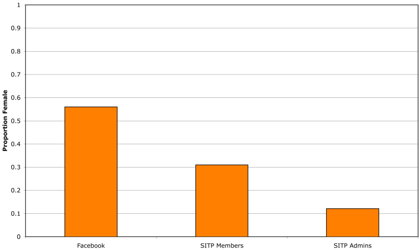 That is pretty bad. Extremely bad. But, it gets worse. If we look at the group administrators10, a paltry 12% are female (Figure 4).