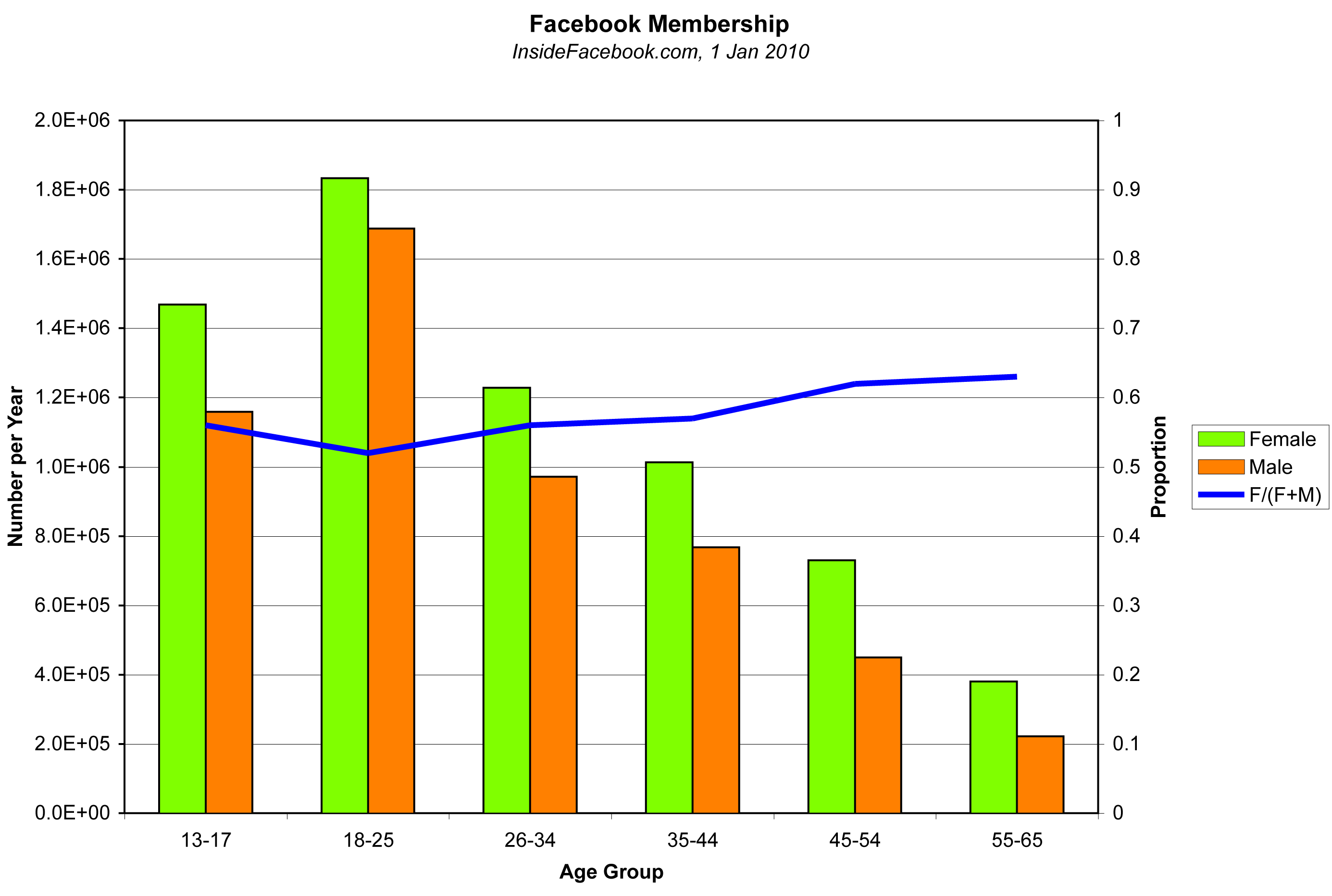 I figured, hey, if the big corporations can buy your privacy from Facebook, I might as well get in on the action too. A number of Skeptics in the Pub (SITP) groups5 organize through Facebook. In order to evaluate whether and/or how much women are under-represented SITP groups, we need to establish the background level of representation in the larger society. In this case, the larger society is Facebook. What is the representation of women of drinking age (these events are occurring in pubs, after all) on Facebook? In the US, women represent 56% of Facebook members above the age of 187 (Figure 1).
