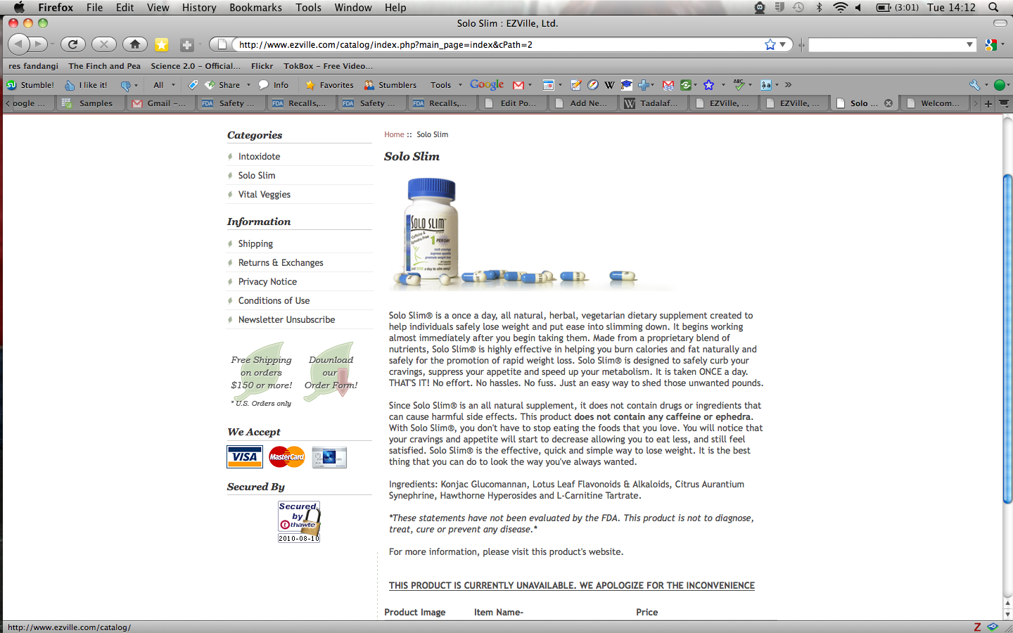 On 6 August 2010, EZVille, Ltd. issued two press releases (Revivexxx and Solo Slim) announcing the recalls. Despite the safety implications of these undeclared drug ingredients, the EZVille, Ltd. websites present no information about the undeclared drug ingredients or the recall (screen capture images are at the bottom of the post). Instead, there seems to be less information available than before. The text of an email sent to EZVille, Ltd. inquiring about their efforts to inform customers of this important health issue is below.