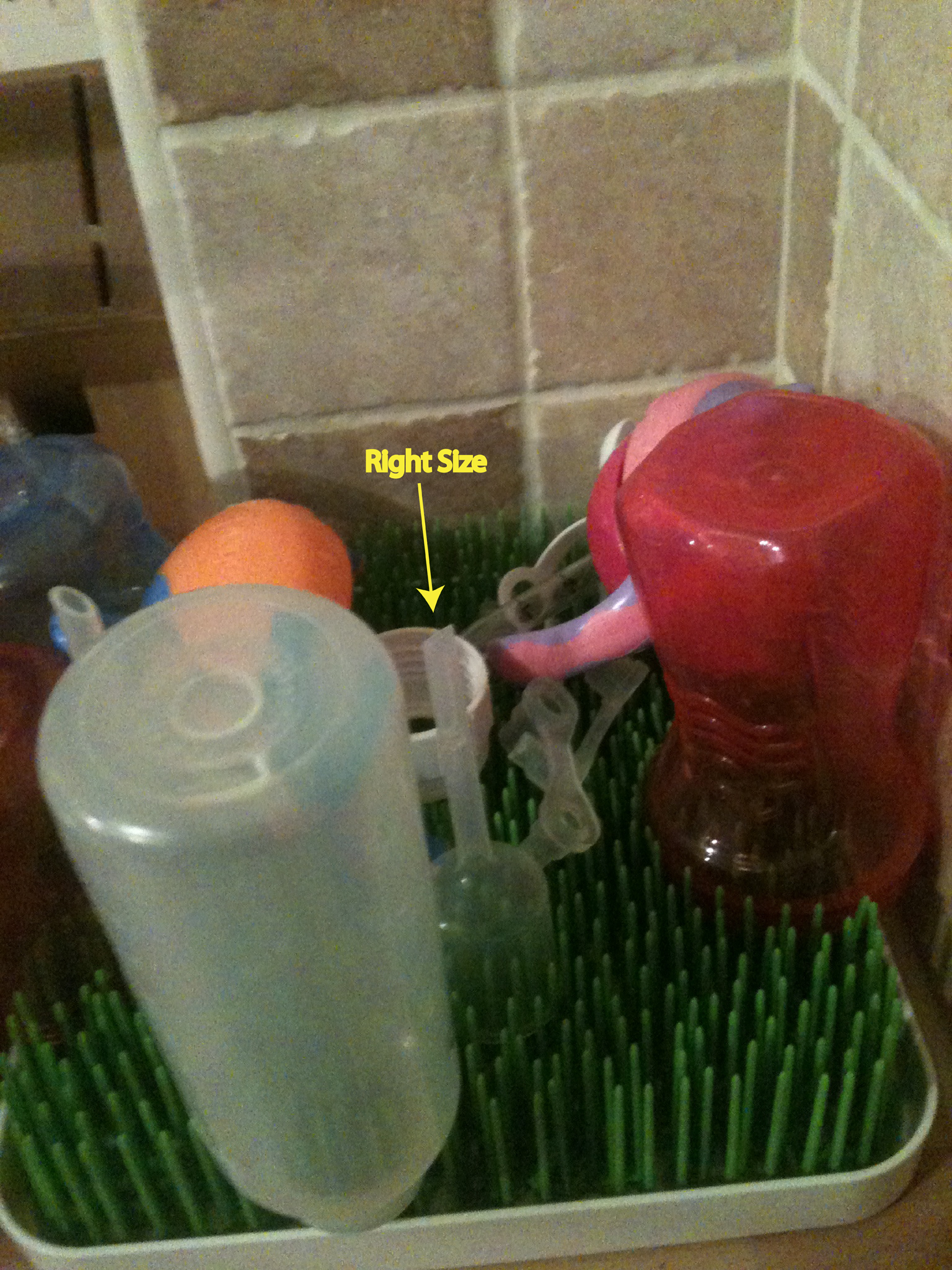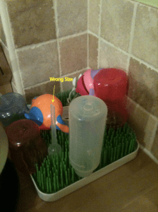 I changed my angle of viewing as represented in Figure 2. Now, you may see the correctly sized “funnel-y” thing, but I did not. In my haste and stress (the plaintive cries of one’s infant progeny do that to you), I literally did not see it*. I looked three times and did not see it. In the end, I just grabbed a spare out of the cupboard. When I came back, in a calmer state of mind, to clean the now sullied bottle, I saw that the missing “funnel-y” thing was sitting right in the middle of the rack.