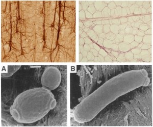 Assuming Identities: Cells take on many different shapes and sizes depending on their identities. Vertebrates like us produce such cell types as neurons (top left) and fat cells (top right). A free living yeast cell can also take on different identities: a nutritionally satisfied yeast cell (bottom left), and a starving, ‘pseudohyphal’ yeast cell (bottom right). Photo credits: neurons, http://brainmaps.org, via the Wikipedia Commons; adipocytes, Dept. Histology, Jagiellonian Medical College via the Wikipedia Commons; yeast cells, from Gimeno, et al., Cell 68:1077-1090 (1992).