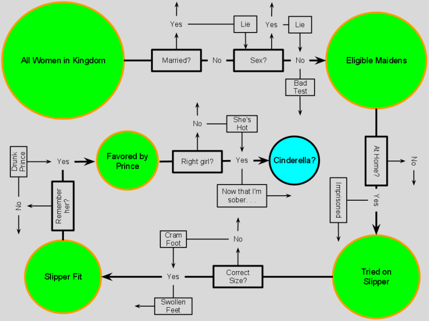 This subset of eligible maidens may then get to try on the slipper. It is reasonable to think that not everyone in this set would actually get to try on the slipper. Some of them might not be home. I imagine that the eligible maidens have busy days, just like the rest of us. Some of them might be locked in towers by their Wicked Stepmothers. The Grand Duke does not seem to have a definitive list of who all the eligible maidens were. So, it is hard to see how they would know that they have tested the entire subset. This step posed a real threat of eliminating the only true positive (Cinderella) in error[9].