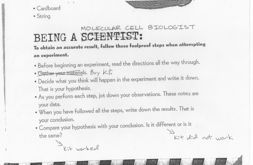I think this is the first spoof of the MythBusters “Being a Scientist” list, as you can see both Mike and my handwriting. My PhD is in Molecular Cell Biology. So, I am making fun of myself, a bit. Well, I’m mostly making fun of the rest of molecular cell biology, because none of these critiques apply to me.