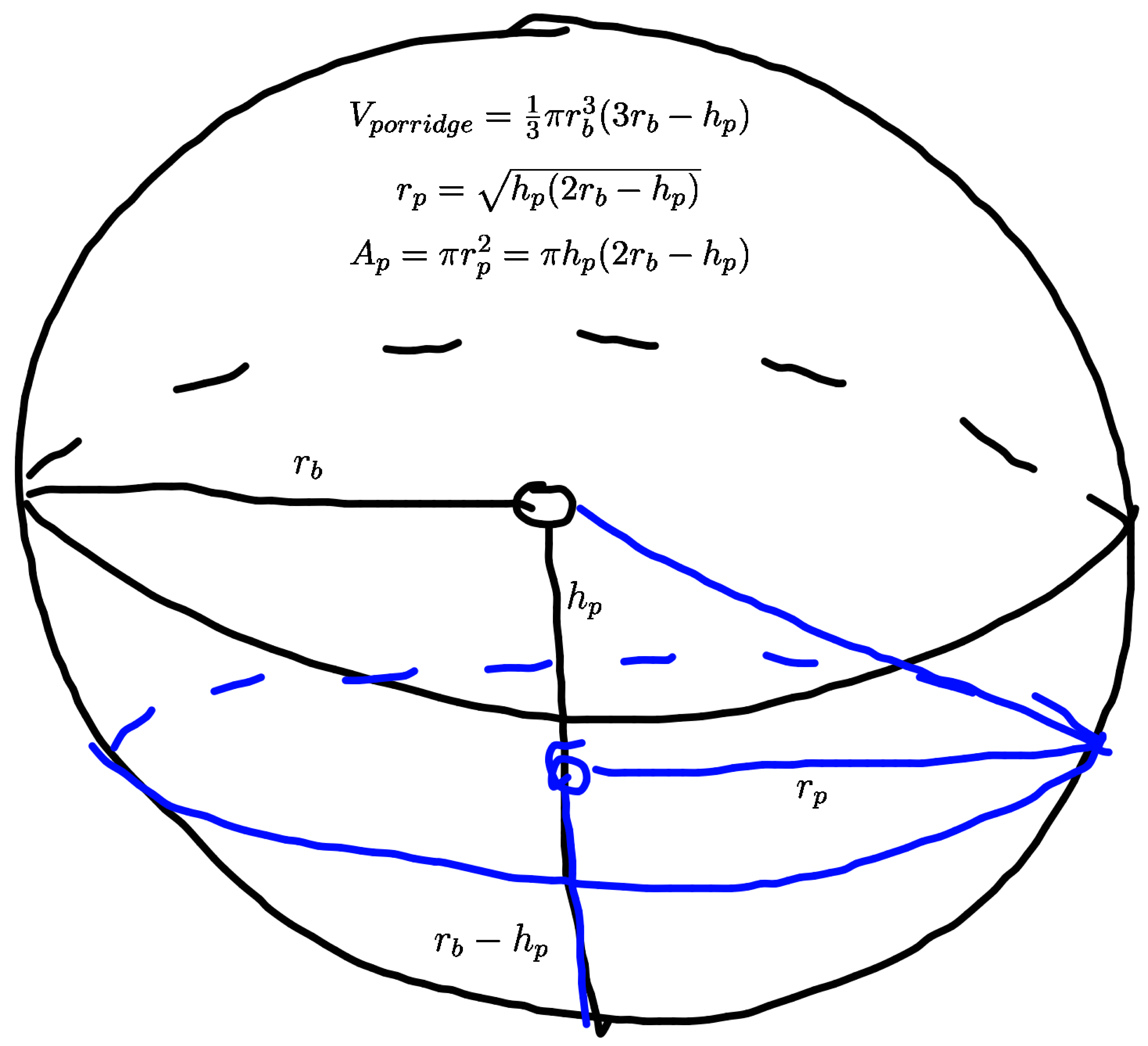 When you are dealing with just a portion of a sphere like the porridge in the bottom of a round bowl, the equations do get more complicated (see right), but the general scaling between surface area and volume is conserved.