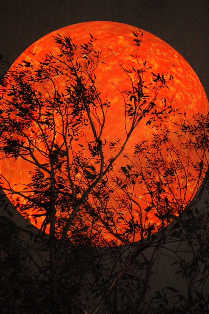 Solar Equation by Rafael Lozano -Hemmer is a public art installation consisting of a simulation of the sun, 100 million times smaller than the real thing. Lozano-Hemmer, a Mexican-born artist with a degree in physical chemistry, creates installations which allow viewers to interact with them via technology. Solar Equation, commissioned by the Light in Winter Festival in Melbourne in 2010, features the world’s largest spherical balloon, custom-manufactured for the project, which was tethered over a public square and animated using five projectors. The solar animation on the balloon is generated by live mathematical equations that simulate the turbulence, flares and sunspots that can be seen on the surface of the Sun, producing a dynamic display that never repeats itself, giving viewers a glimpse of phenomena observable at the solar surface. The project uses SOHO and SDO solar observatory imaging from NASA. Using a downloadable iPhone or iPad app, people may disturb the animations in real-time and select different fluid dynamic visualizations.