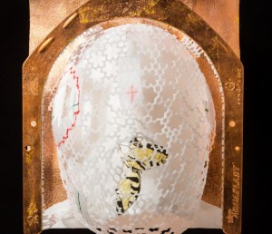 By contrast, Breath, by Beverly Ress, left the mask much more intact, but with subtle changes suggested a both a sense of transformation and the devotional aura of an icon. In her words: “I began by pulling the frame of the mask forward into a kind of Renaissance wimple. I cut open the mouth and began to imagine breath—the primal force of life. I attached an intaglio print of a butterfly that I had made several years ago. It is a reminder of breath and lends a skin-like translucency to the piece.”