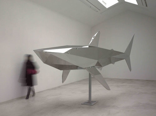 Hirst’s real shark (the original fish eventually decayed and was replaced in 2006) has its mouth open to display those cruel teeth. In contrast, French artist Xavier Veilhan creates sharks out of steel sheets folded like origami, taking away all but the scale and the familiar silhouette of the predator. They’re still scary. This could be the perfect piece of art for the lobby of a hedge fund.
