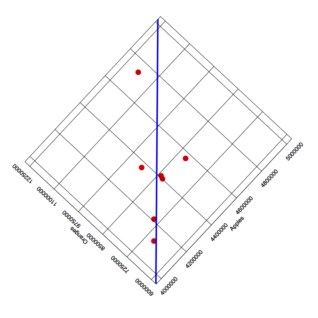 Knowing that apples and oranges are highly correlated is not worthless information either. It is quite likely that apples and oranges are correlated because at least some of the variation in both is caused by the same factors, such as rainfall. So, we want to keep the correlation information (it gives us hints), but lose the implication of causation. What if we disrupted the linear association between the axes that we are used to – that we have been trained to associate with causality? What if we twisted our plot, say 45°?