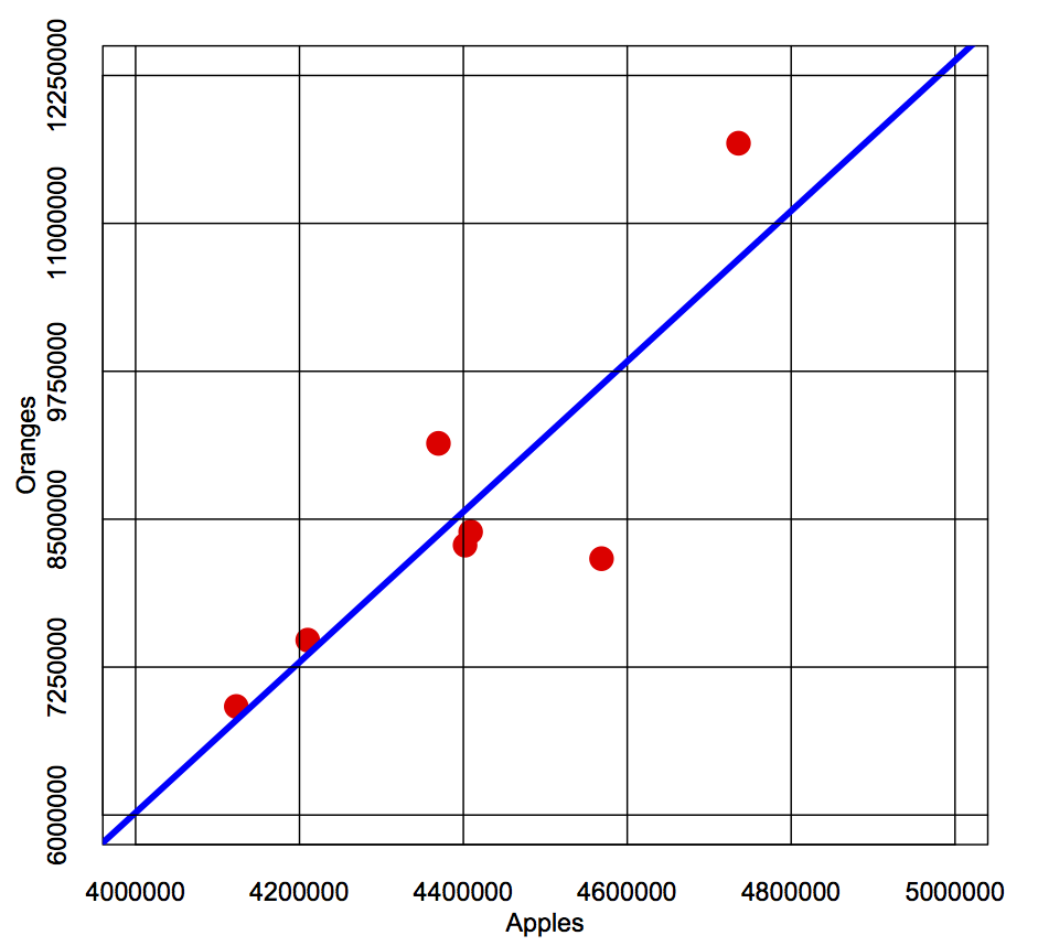 How can we embed the distinction between correlative and causative relationships without eliminating the benefits of the two-dimensional plot? I have a pretty simple solution that works for me; but does it work for you? Let’s start with a traditional plot of data. We’ll plot the amount of apples produced in the United States between 2004-2010 (metric tonnes)1 on the x-axis and the amount of oranges1 on the y-axis.
