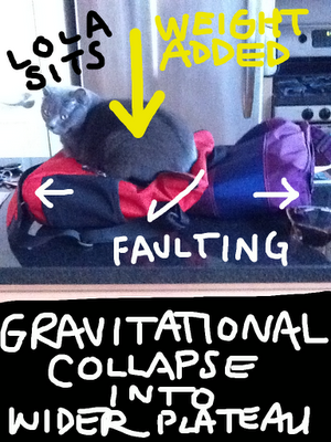We’ve had biology, physics and genetics lolcats here at the Finch & Pea, but we must admit that our personal feline friends don’t know much about geology. Luckily, there’s a whole blog to help people learn about rocks with the help of kitties. It’s called Geokittehs, and it’s run by geologists and bloggers Evelyn Mervine and Dana Hunter. With the assistance of some very clever cats, they explain geological phenomena such as weathering, subduction, lava flows and stream capture. Here, guest cat Lola illustrates normal faulting.