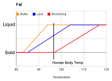 As we’ve already discussed, the purpose of the fat is to separate the flakes of dough. It is doing this job both before it hits the oven and while it bakes aways. However, it is the time in the oven that really makes a difference in flakiness. This all comes down to melting temperature. Quite simply, we need a fat to stay solid long enough for the dough flakes to cook into crust flakes.