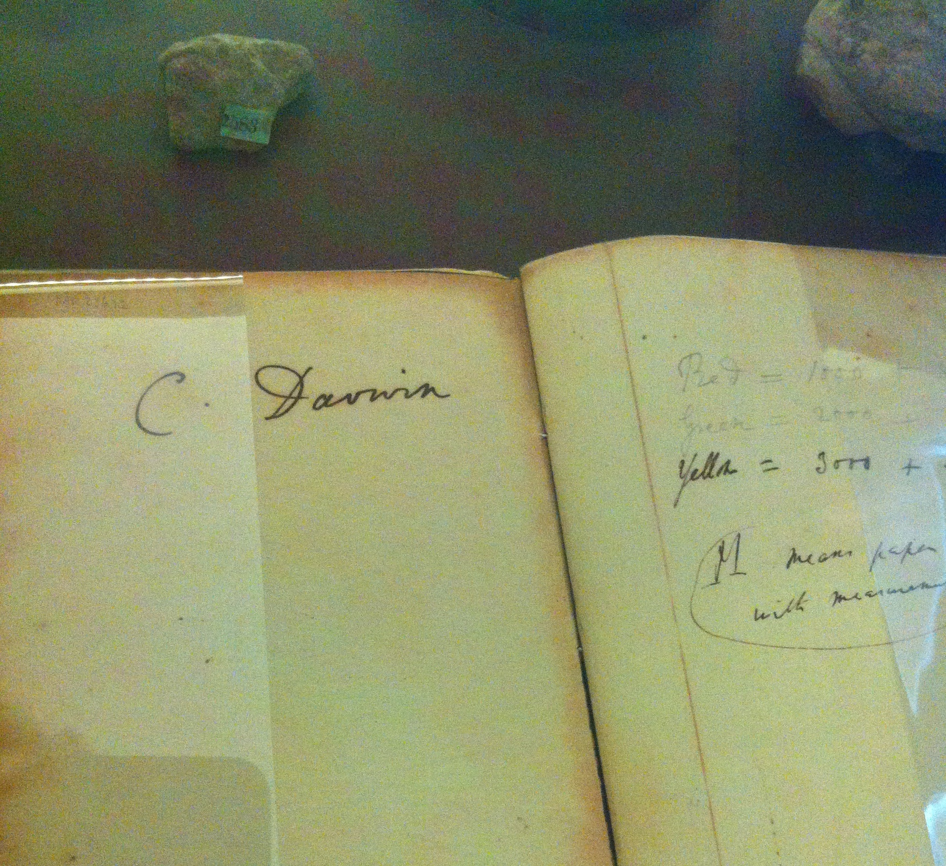 I normally turn left when I enter, past the Ice Ages, all the way to the very end of the timeline. There, in a simple display case just like the others, are some of Darwin’s original notebooks with rock specimens from the Beagle. We now tend to remember Darwin mainly for his contributions to biology, but he was hired on board the Beagle to help with the geological exploration of the lands that they visited. The Sedgwick Museum has an entire section dedicated to Darwin’s geological work, but I really just like seeing the notebook with “C. Darwin” written in it.