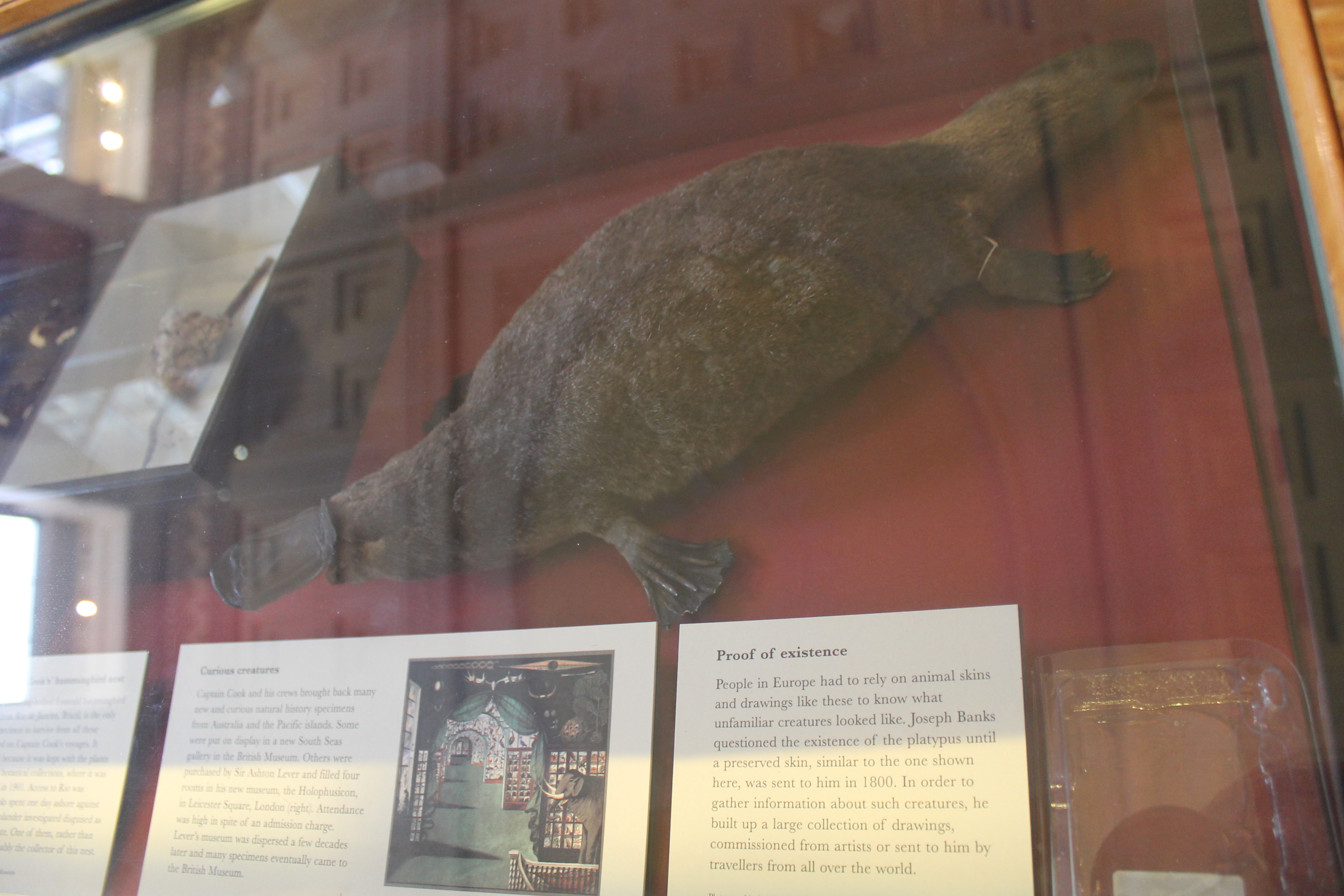 The natural history section of the room contains a stuffed platypus. When the platypus was first discovered, people didn’t really believe that an animal that strange really existed. Bringing back an intact skin and displaying that helped convince people that this weird creature was real.