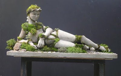 Robert Cannon refers to his sculpture technique as terraforming, a word used by scientists to describe the process of creating habitable, “earth-like” environments in places like the moon or other planets.  Cannon’s terraforms are much more, shall we say, down-to-earth. He builds them, often in the shapes of people, out of hollow shells of ferro-cement, adding pockets of earth and plants in the places where the pieces connect.  They look a bit like androids whose spaceship landed in the Garden of Eden.