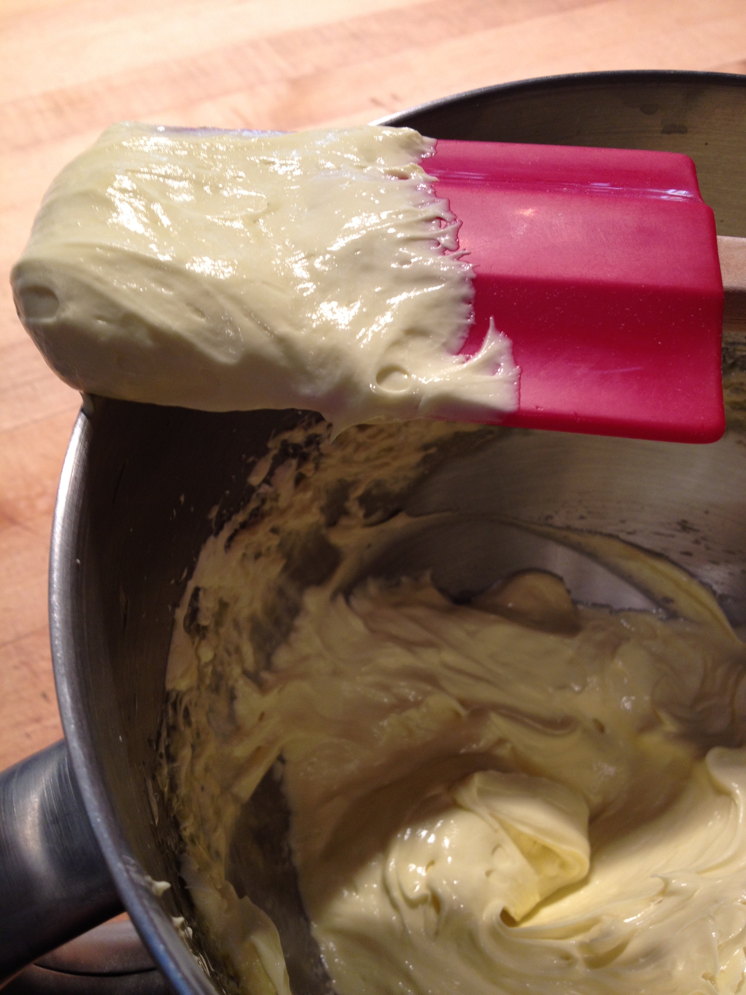 The real key to this particular buttercream thought is the egg yolks. Since we are adding a liquid fat (olive oil), we need to ensure that it will incorporate smoothly into the rest of the mix. Solid butter is already in an emulsified state. So, we don’t have to worry about it. Once again, the lecithin in the yolks helps combine the oils with the liquids. We’ll start by adding about half the butter first. This will create an emulsified base, which will make it easier for the oil emulsify itself. We then slowly drizzle in the oil while the mixer is running. Our mixture should look a bit like mayonnaise once all the oil is added, because what we have here is not extremely different in structure than mayonnaise. Add the rest of the butter and we’re there.