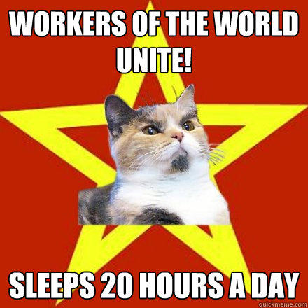 Yesterday was May 1, also known as International Workers’ Day, a celebration of labor and the working classes that is promoted by the international labor movement. Although it is barely celebrated in the US, it’s a big deal in communist and socialist countries, with parades and festivities, and of course, a day off work. Every day is a day off work for cats, so let’s just say they celebrate this one on behalf of their humans, who trudge off to work each day to earn the money to provide noms, warm pillows and fluffy mice.