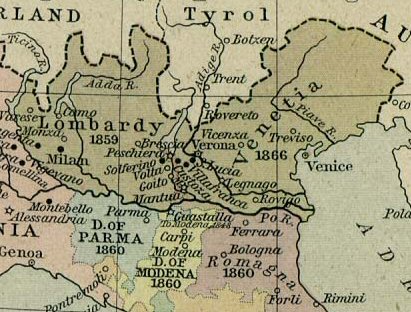 Picture these two men, dressed in their artists blouses, walking across large parts of Switzerland. Looking nothing like the academics they were in Heidelberg, they reached the Kingdom of Lombardy-Venetia. This kingdom no longer exists. The area is now Northern Italy, but was then part of the Austrian Empire, and Austrian police were on the lookout for a political fugitive.