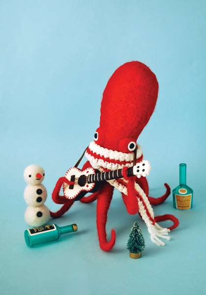 Hine Mizushima is a Japanese-born artist who lives in Canada and makes offbeat felt sculptures of things like banana slugs and daphnia. For the holidays, I love her simple but striking postcards featuring a bright red octopus playing a ukulele.