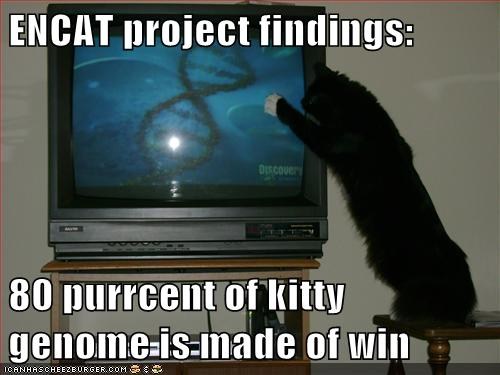 Ubber 20% = 5% snuggles, 5% noms, 5% ebil and 5% catnip. Moar interested in hoomin DNA? See Josh Witten’s latest post on the ENCODE project here.